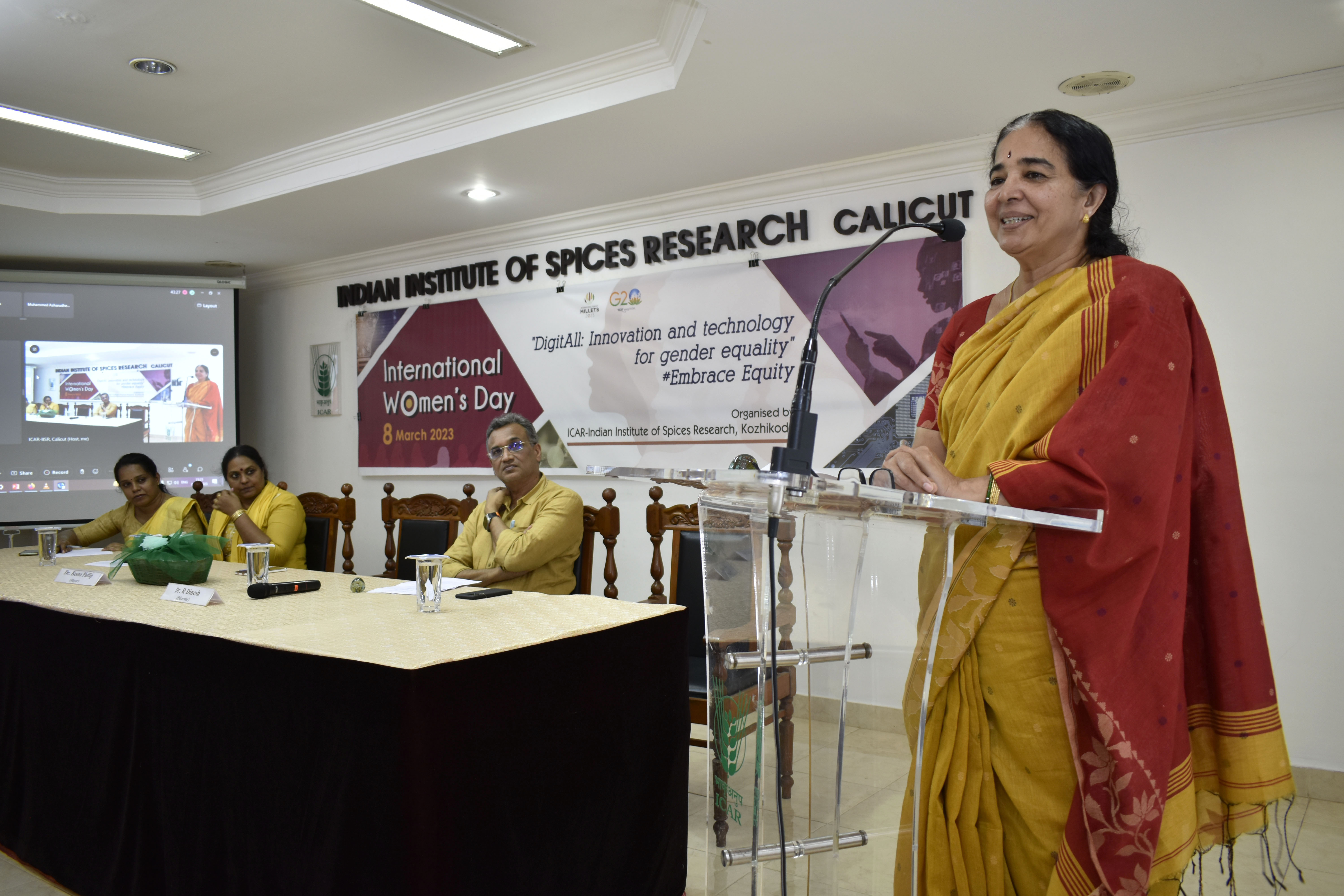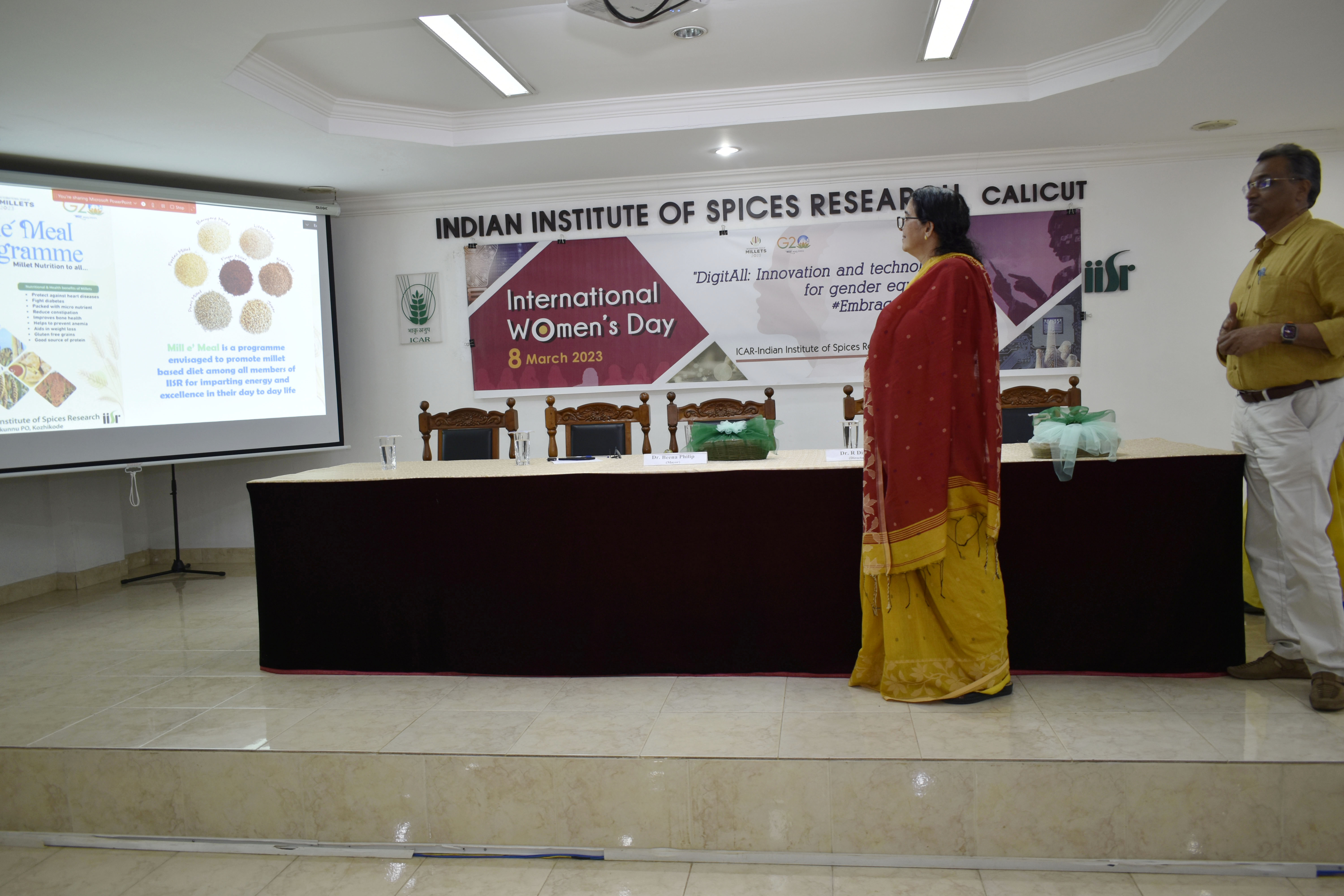 ICAR- Indian Institute of Spices Research, Kozhikode celebrated International Women’s Day on 8th March 2023. On this occasion, a motivational and inspirational talk on the theme “DigitALL: Innovation and technology for gender equality”was delivered by the chief guest, Dr. Beena Philip, Mayor of Kozhikode. In her talk she emphasised women getting updated with new innovative technologies can reduce gender inequality and also opined that gender is a sociological term which should include all vulnerable groups. Successful woman entrepreneurs Mrs. Bindu Joseph and Mrs.Geetha Saleesh shared their experiences. Traditional “Curry blends” developed by a women entrepreneur Mrs. Nisha Manimala of Kattipara Coconut Industries Pvt. Ltd was also launched on the same day. On this special day, in solidarity with the International Year of Millets 2023, a programme named ‘Mill e´ Meal’ was launched by the Mayor at the institute. This launch commemorates the traditional value of millets and promotion of millet based diet among the staff members to boost energy and excellence. The function was presided over by Dr. R. Dinesh, Director & Chairperson (Women Cell). Dr. T. E. Sheeja and Dr. S. Aarthi also spoke on the occasion.